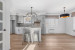 -Cuisine : moderne et fonctionnelle avec grand îlot central, armoires gris pâle, dosseret en mosaïque et luminaires tendance.