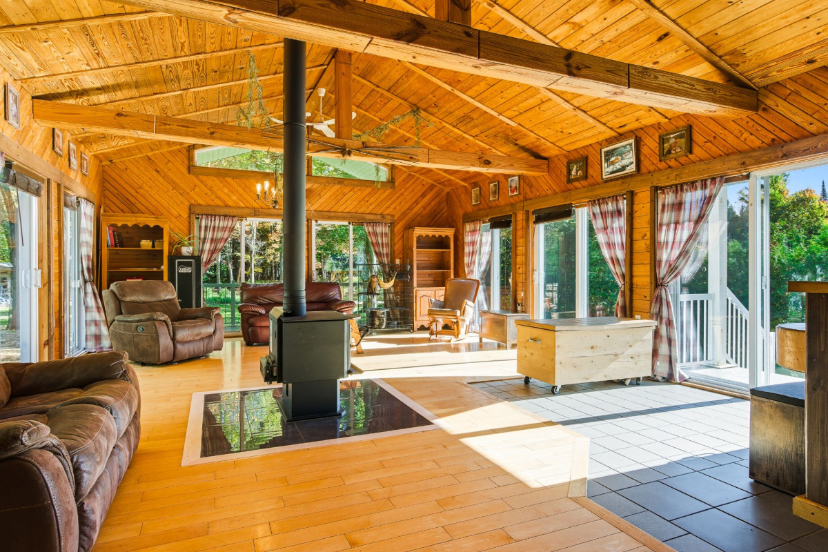Salon spacieux avec plafond cathédrale, poutres apparentes, fenestration abondante et foyer au bois central créant une atmosphère invitante. Vous serez charmés par cette espace donnant sur la cour arrière et offrant une vue apaisante sur la cour et le boisé. Un espace paisible qui offre une belle continuité entre l'intérieur et la nature environnante.