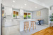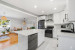 La cuisine entièrement rénovée en 2023, véritable coeur de la maison, marie style et fonctionnalité : armoires blanches modernes, dosseret de céramique, hotte cheminée en acier inoxydable et îlot central idéal pour cuisiner ou en tant que comptoir/lunch.
