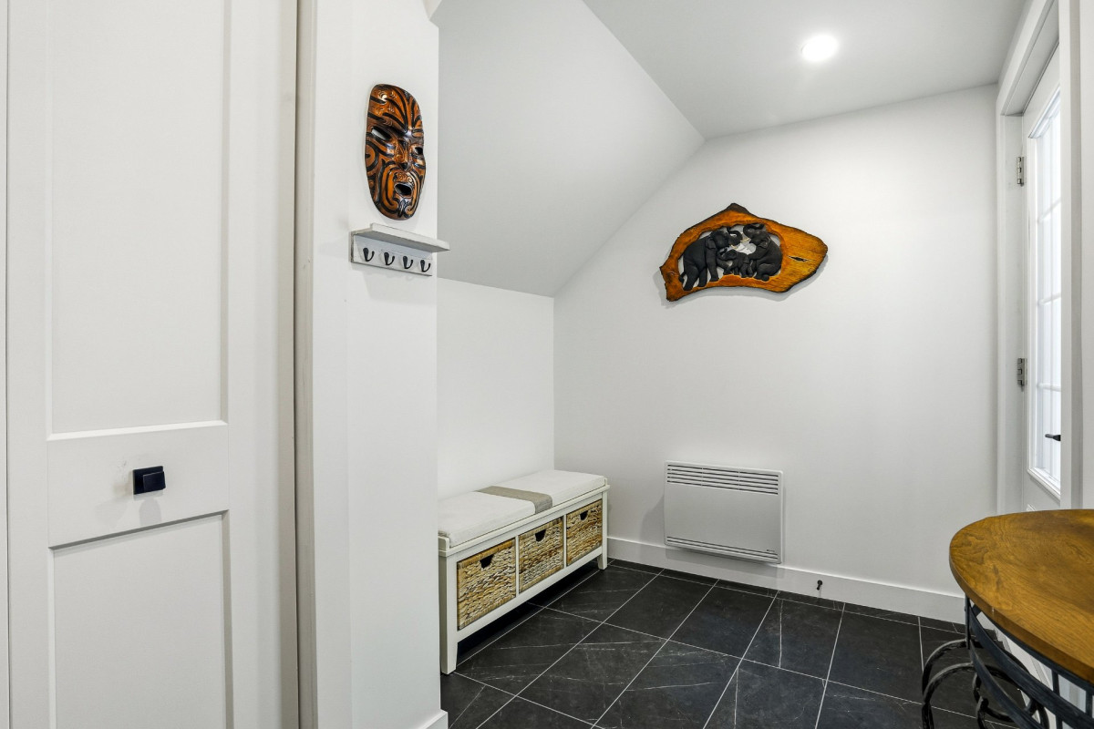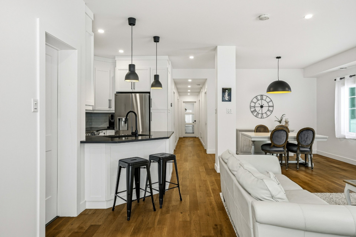 Le salon, chaleureux et invitant, est parfait pour les soirées cocooning. La salle à manger, lumineuse et bien positionnée, permet d'accueillir famille et invités. La cuisine propose des armoires pleine hauteur, un comptoir en quartz, un dosseret métro intemporel et un éclairage moderne. Chaque élément a été pensé pour offrir style et fonctionnalité.