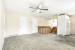 Salon spacieux et lumineux avec plancher flottant, ventilateur de plafond et porte-patio donnant sur la terrasse arrière.