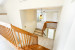 Salle à manger conviviale ouverte sur l'escalier central menant au salon surélevé.