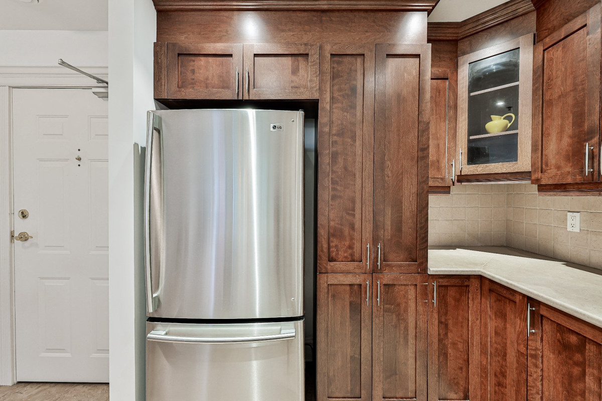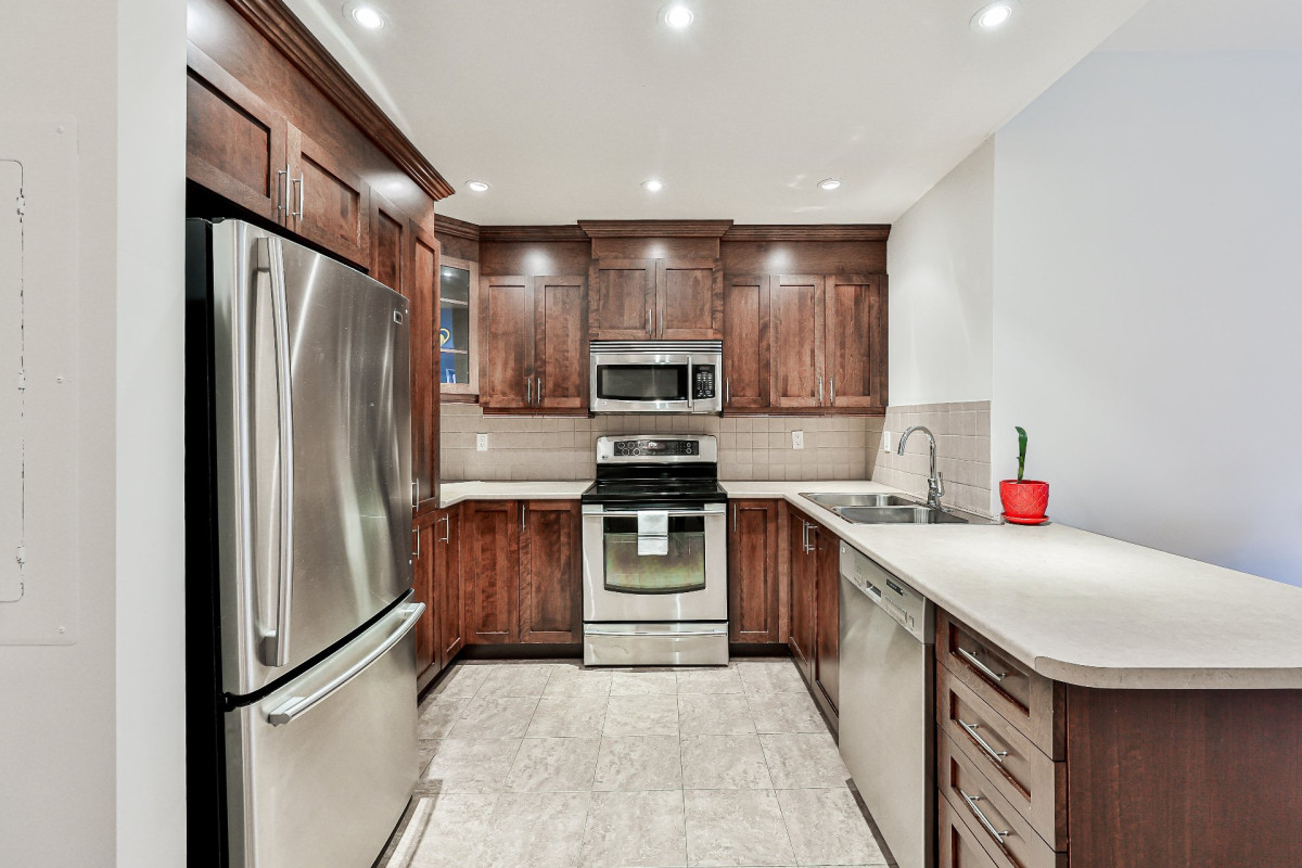 La cuisine fonctionnelle se distingue par ses armoires pleine hauteur, ses électroménagers en acier inoxydable et son comptoir-lunch pratique.