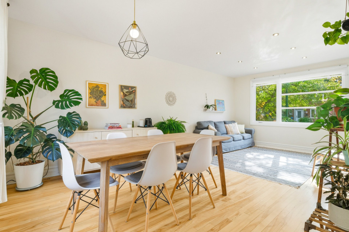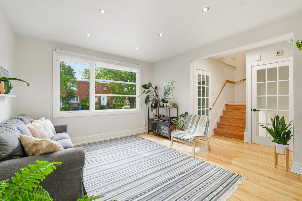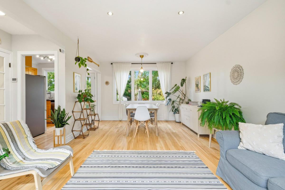 Le salon, baigné de lumière grâce à sa grande fenestration, offre une atmosphère conviviale et accueillante. L'aire ouverte se prolonge vers la salle à manger, où la vue sur la cour arrière ajoute une touche de nature et de sérénité.