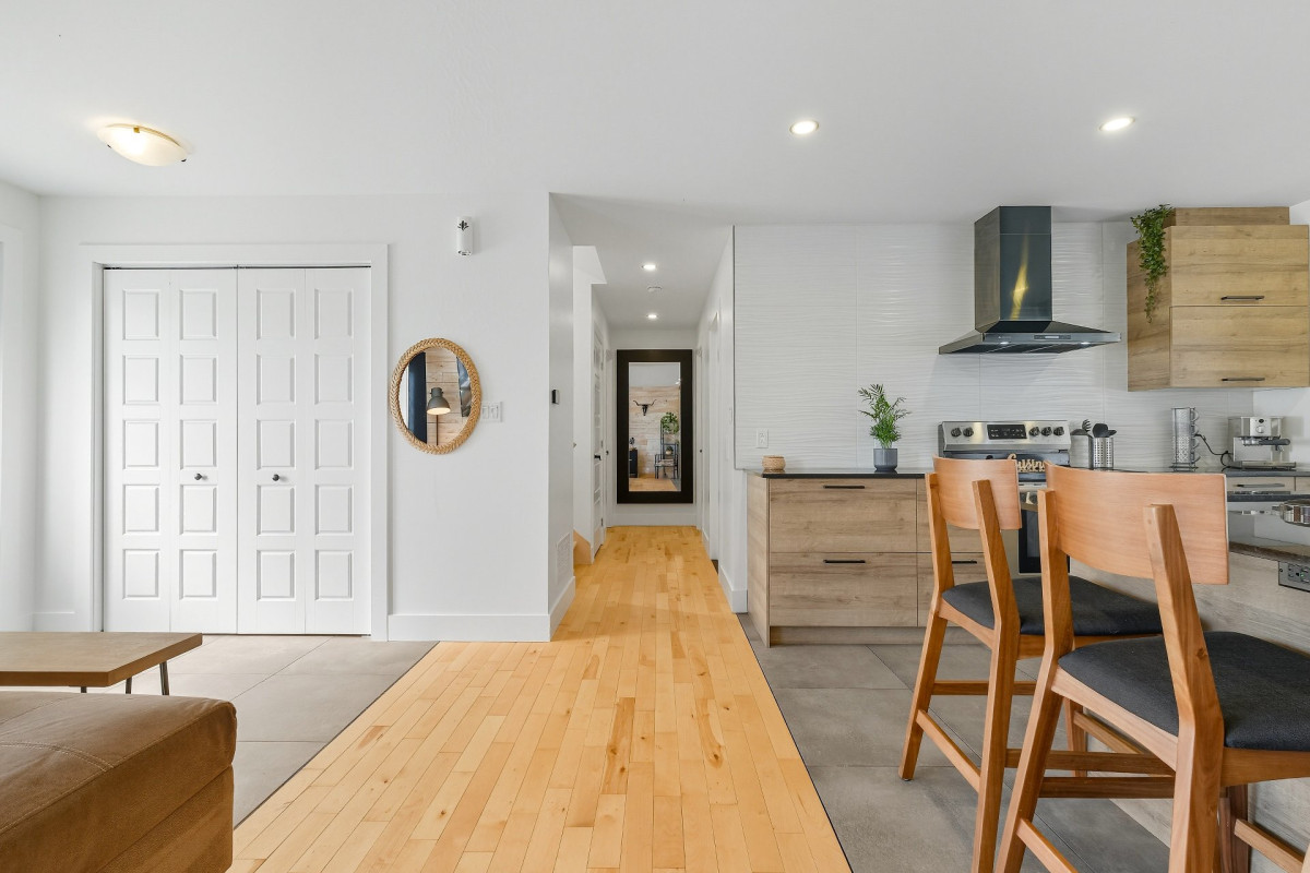 Salon lumineux avec plancher de bois franc et décoration épurée.