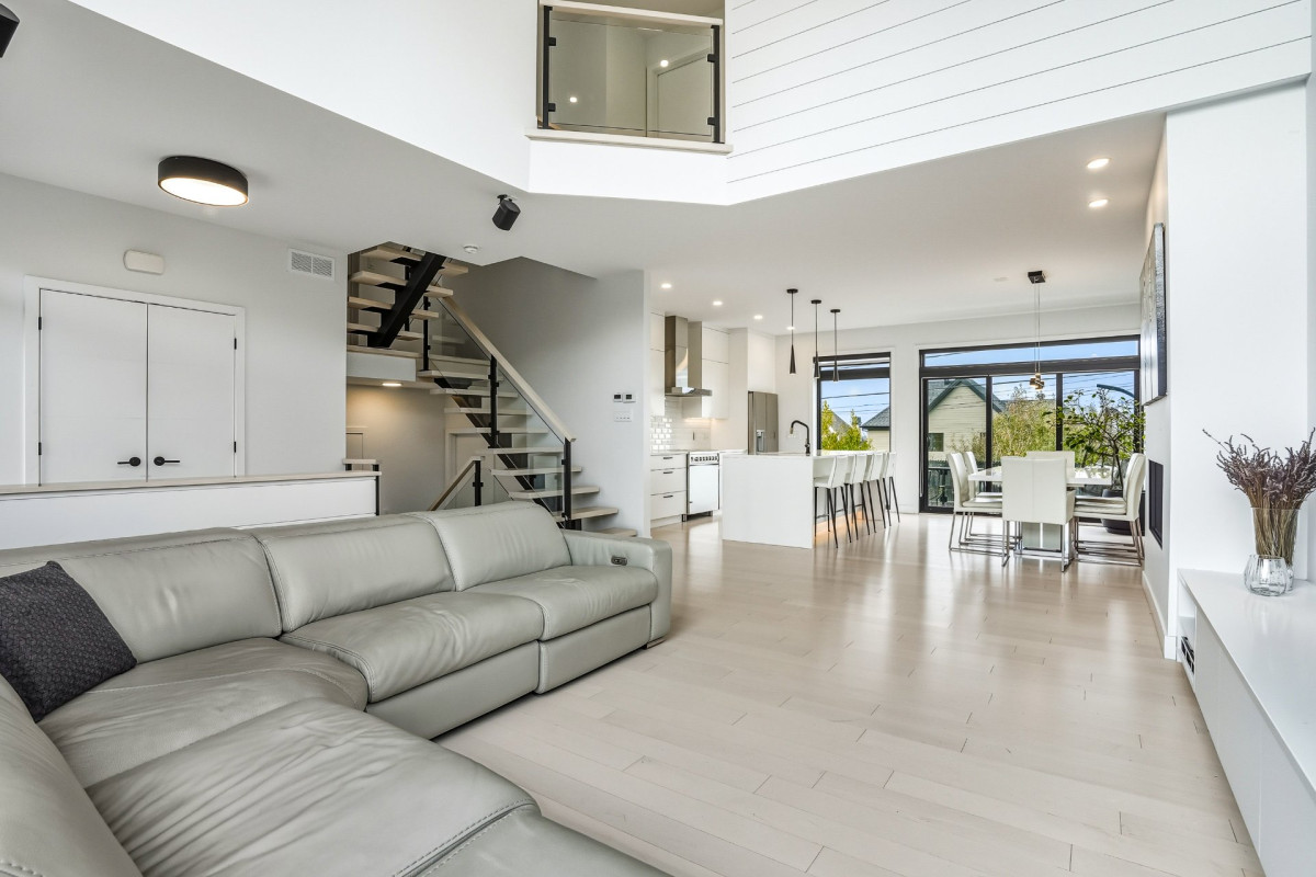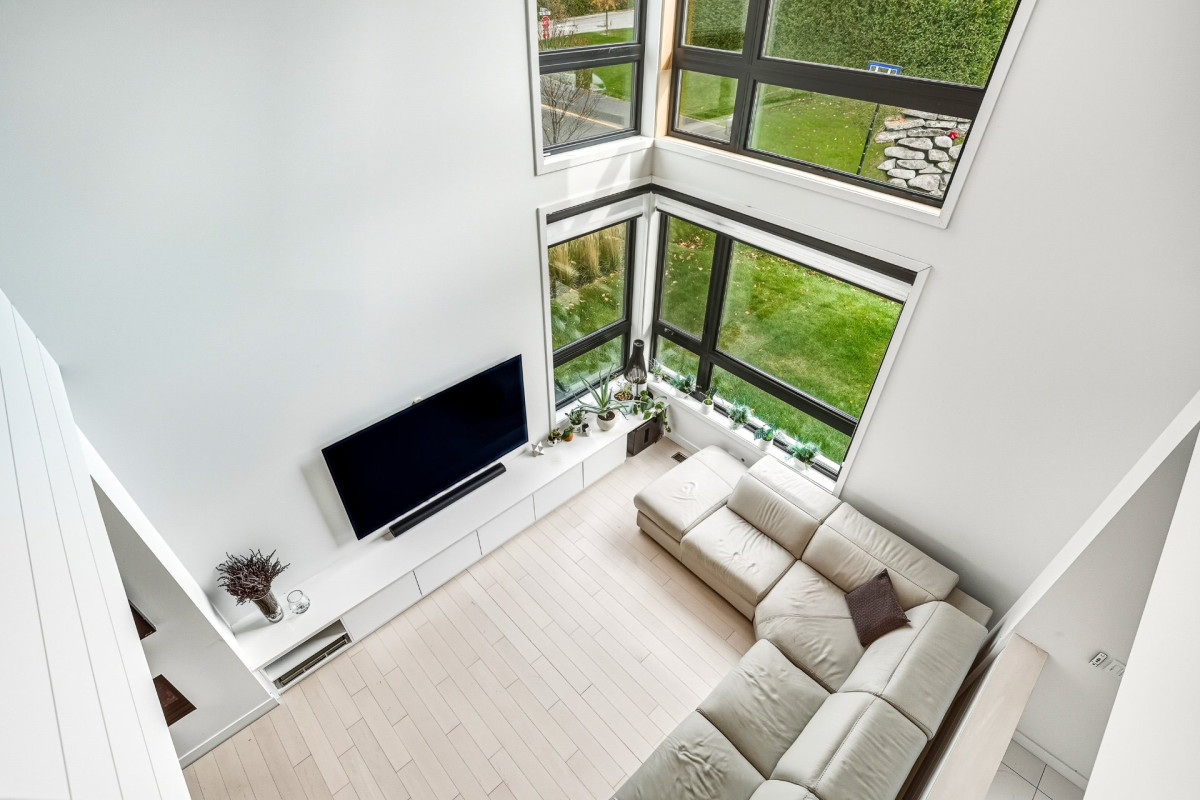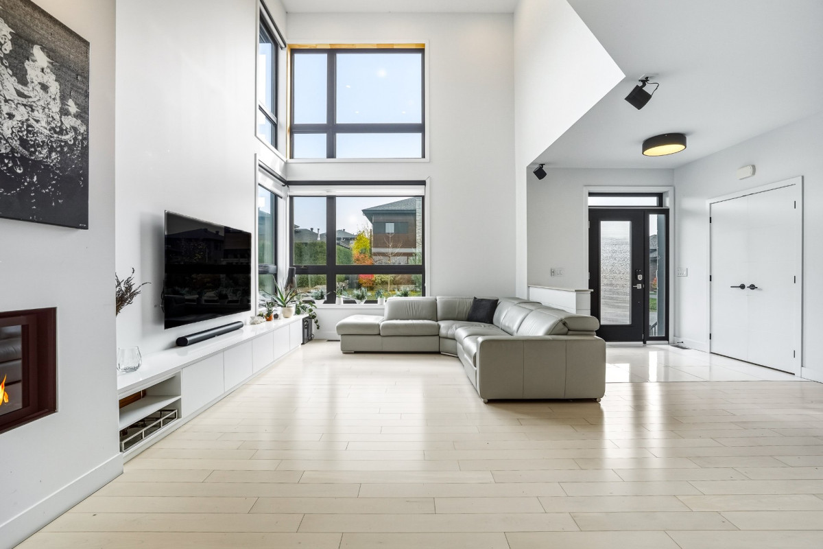 Le salon, doté d'un plafond d'une hauteur majestueuse de plus de 15 pieds et d'une généreuse fenestration donnant vue dégagée sur le Mont Saint-Hilaire, se démarque par son ambiance chaleureuse et sa luminosité naturelle.