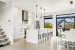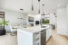 La cuisine, au design contemporain, propose un grand îlot central, des comptoirs en quartz, un dosseret élégant et un éclairage DEL sous les armoires et l'îlot, donnant une ambiance zen en soirée.