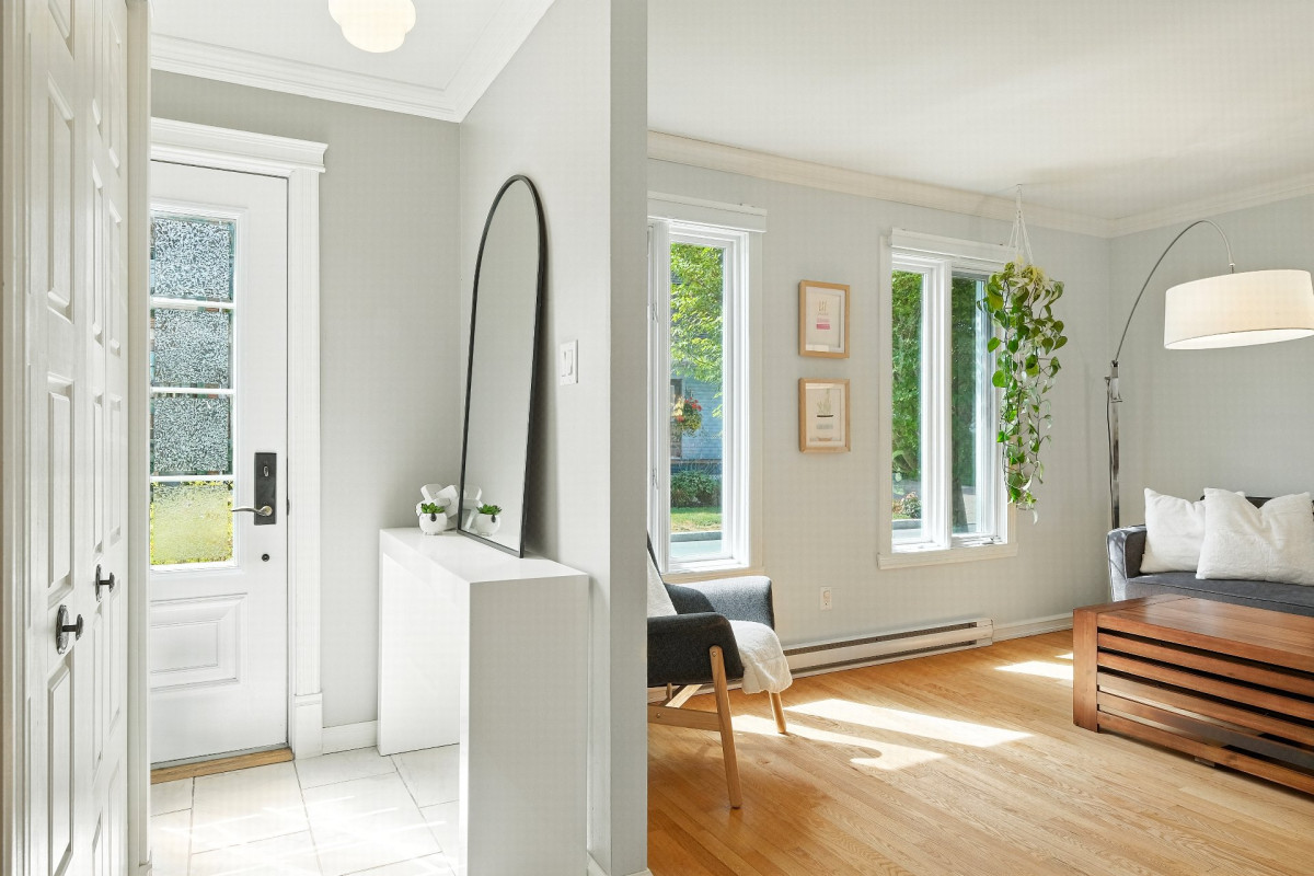 -Salon lumineux agrémenté de grandes fenêtres laissant entrer la lumière naturelle et mettant en valeur les planchers de bois