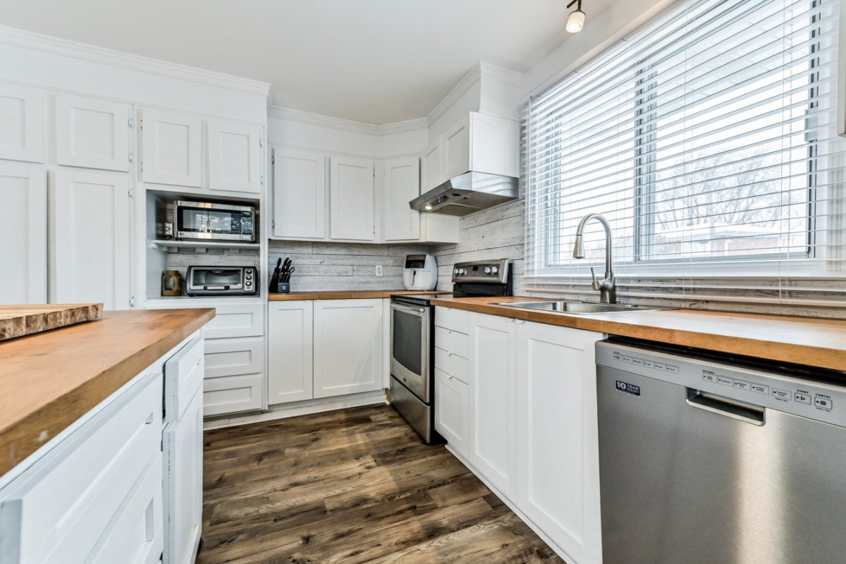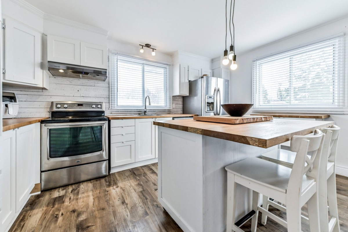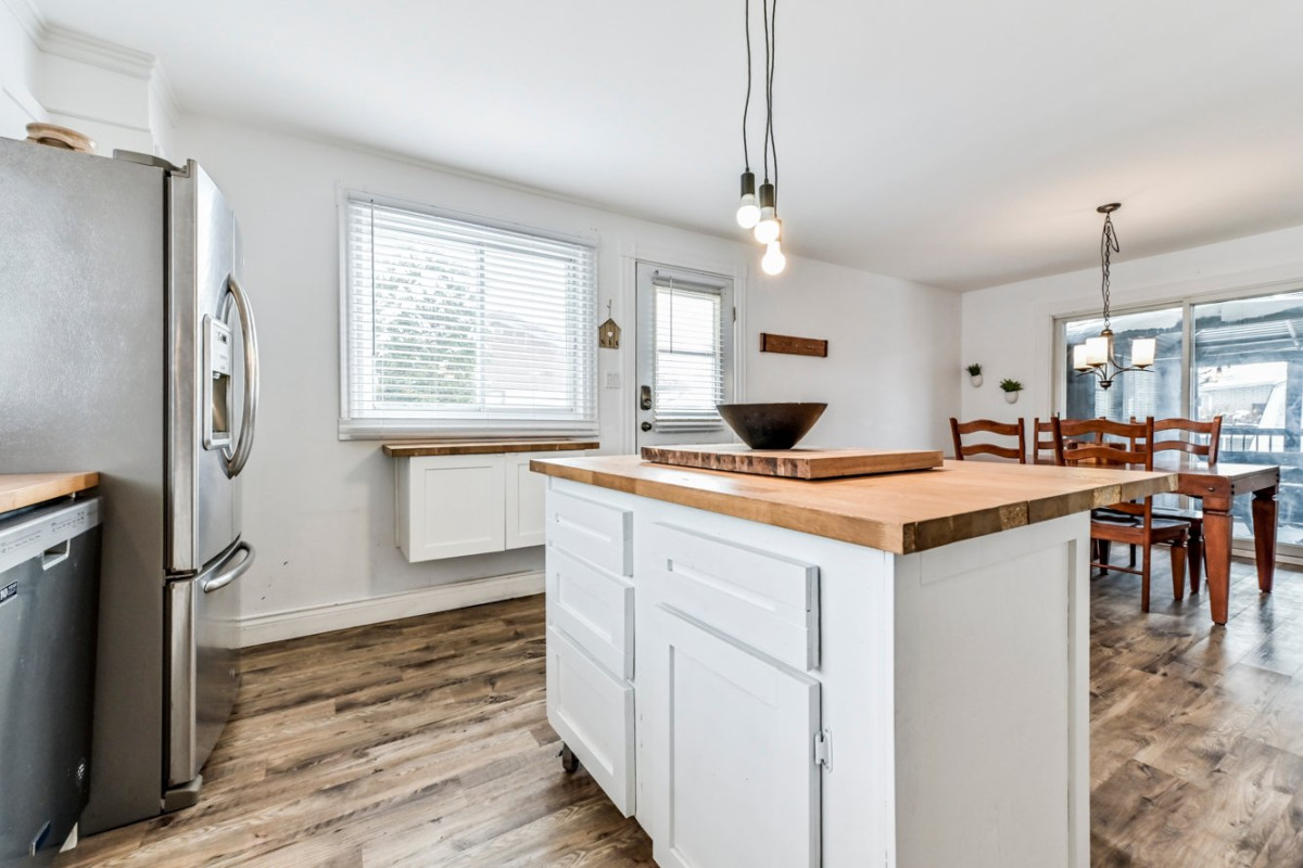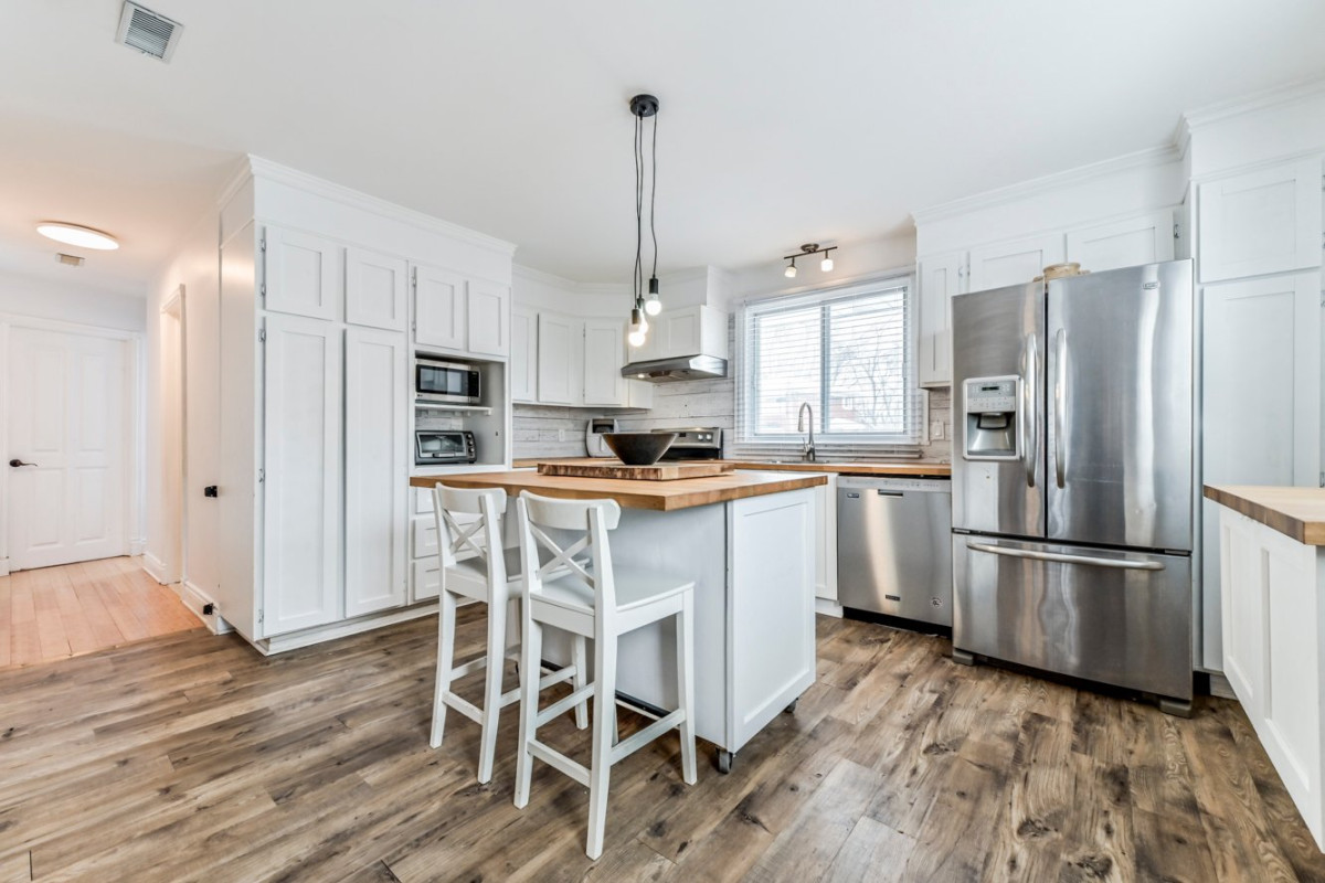 La cuisine, joliment rénovée, propose beaucoup de rangement, de beaux comptoirs en imitation de bois et un îlot central pratique.